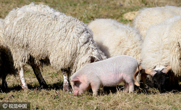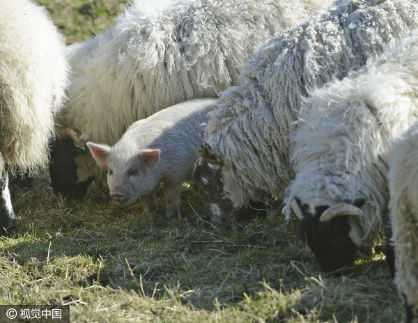 ▲小豬「寶貝」自以為是綿羊,整天混在羊群堆裡。(圖/CFP)